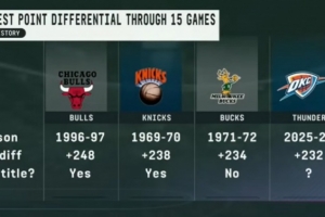 1-4分别是1996-97赛季公牛(夺冠)、1969-70赛季尼克斯(夺冠)、1971-72赛季雄鹿,本赛季的雷霆