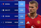 英超BIG6防线人均身价排名:阿森纳5500万第1,曼联2100万垫底