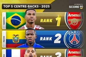 Score90评2025后卫+门将最佳:中后卫加布里埃尔 ,门将库尔图瓦